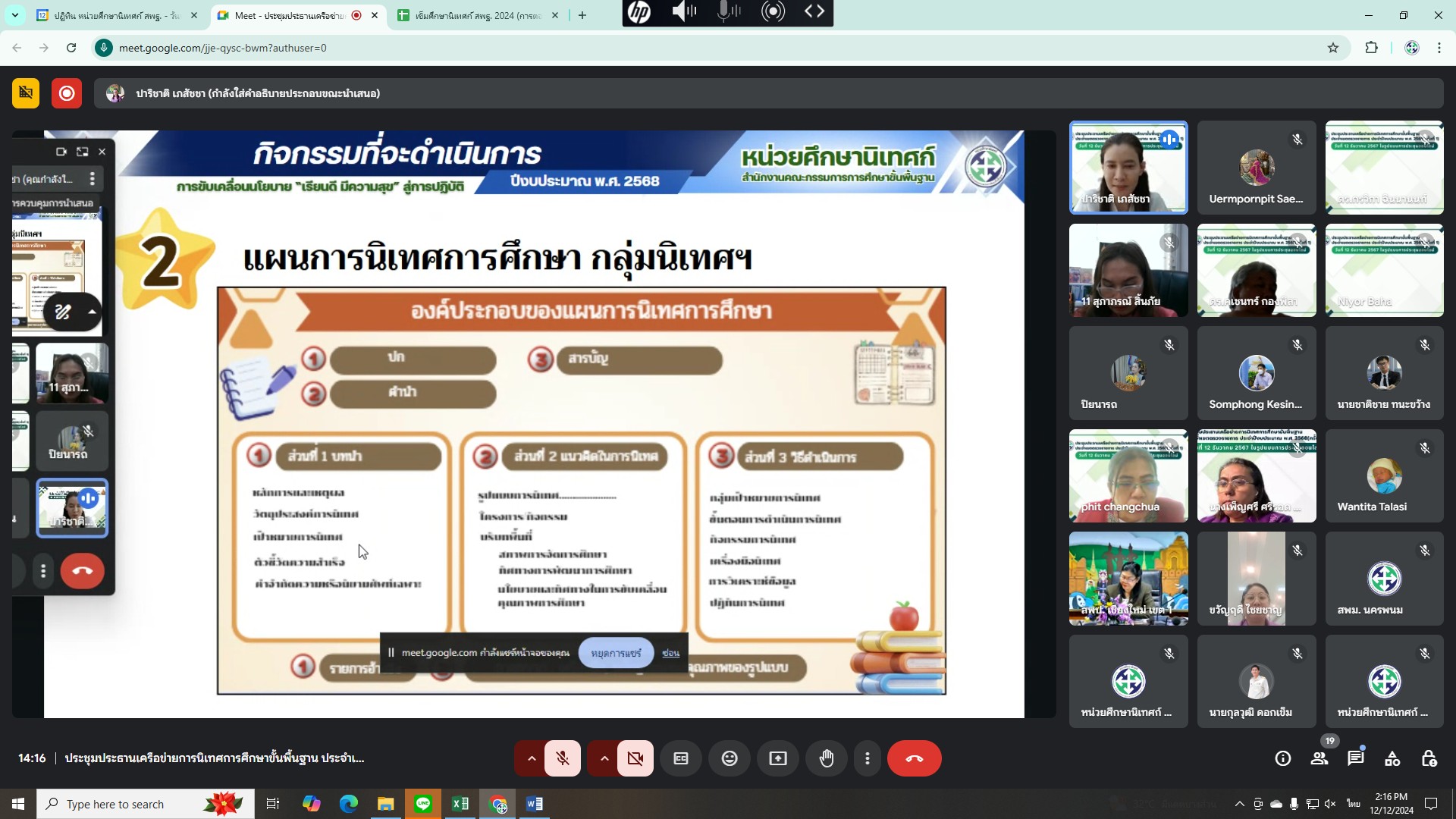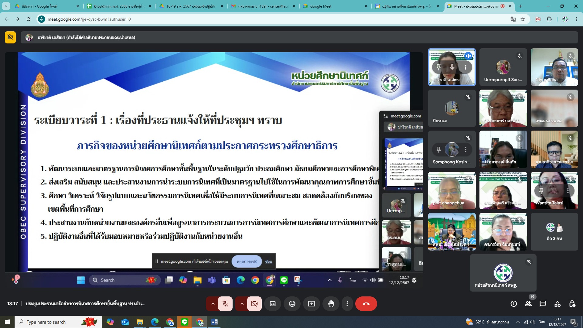วันที่ 12 ธันวาคม 2567 นางสาวปาริชาติ เภสัชชา ศึกษานิเทศก์เชี่ยวชาญ ปฏิบัติหน้าที่หัวหน้าหน่วยศึกษานิเทศก์ สำนักงานคณะกรรมการการศึกษาขั้นพื้นฐาน ร่วมประชุมประธานเครือข่ายการนิเทศการศึกษาขั้นพื้นฐาน ประจำเขตตรวจราชการ ประจำปีงบประมาณ พ.ศ. 2568 (ครั้งที่ 1) เพื่อประชุมหารือสะท้อนคิดและแสดงข้อคิดเห็นการดำเนินการของหน่วยศึกษานิเทศก์ หัวข้อการประชุม - แผนดำเนินการ/แผนปฏิบัติการ/แผนการนิเทศบูรณาการ หน่วยศึกษานิเทศก์ - เอกสารทางวิชาการ/สื่อ การนิเทศการศึกษา - ปรับปรุงฐานข้อมูล และพัฒนาแพลตฟอร์มการนิเทศการศึกษา - หลักสูตรเสริมสมรรถนะการนิเทศการศึกษาสำหรับศึกษานิเทศก์ - การแลกเปลี่ยนเรียนรู้และหลักเกณฑ์คัดเลือกนวัตกรรมการนิเทศการศึกษา - การพัฒนารูปแบบการนิเทศการศึกษาขั้นพื้นฐานที่มีประสิทธิภาพ (วิจัย) ผู้เข้าร่วมประชุม ประกอบด้วย ประธานเครือข่ายการนิเทศการศึกษาขั้นพื้นฐาน ประจำเขตตรวจราชการ จำนวน 18 คน อ่านเพิ่มเติม.