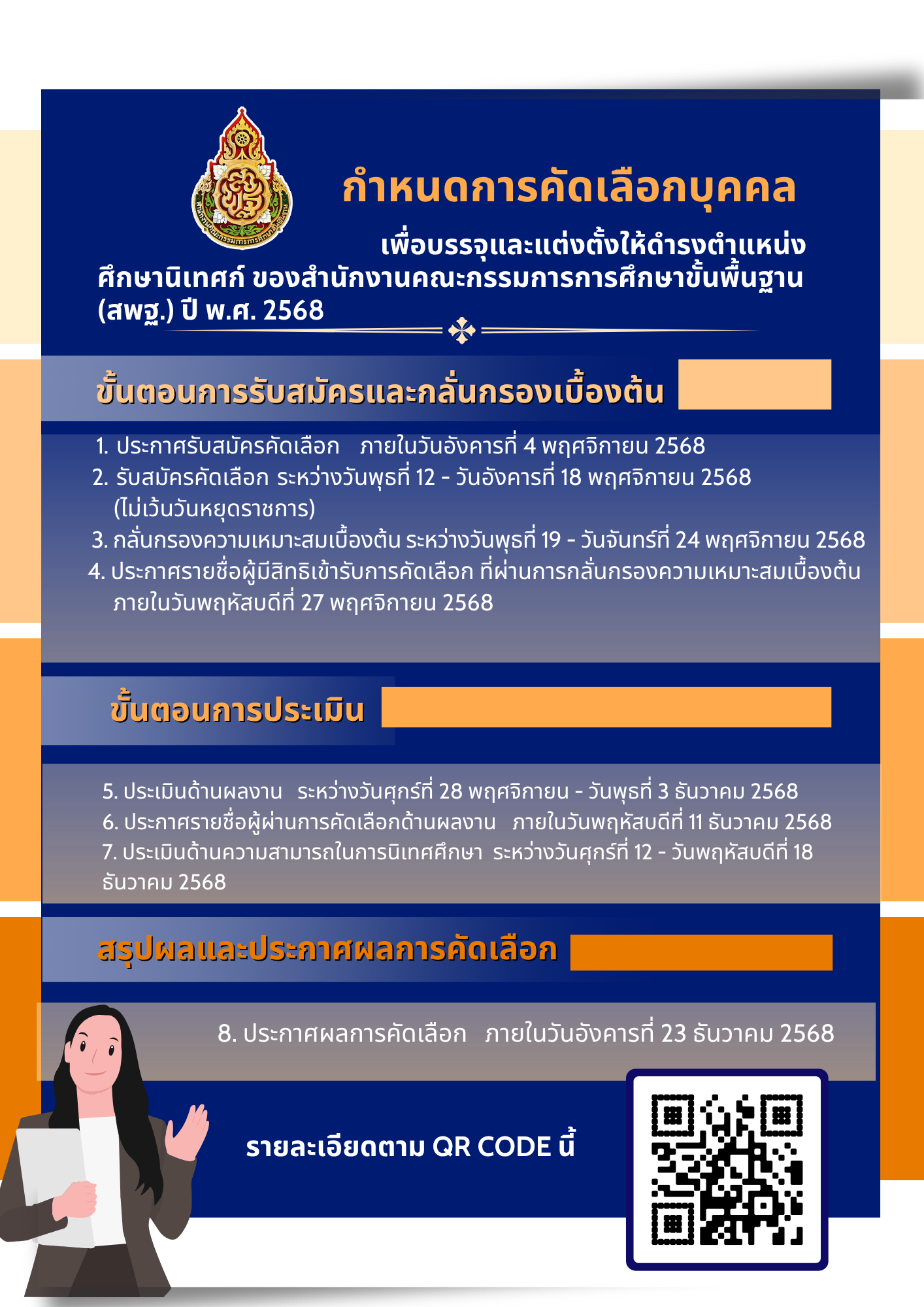 ด่วน! สพฐ.เปิดรับสมัครบุคคลเพื่อบรรจุและแต่งตั้งเป็นศึกษานิเทศก์ ปี พ.ศ. 2568 สำหรับผู้ที่สนใจร่วมพัฒนาการศึกษาไทย ประกาศรับสมัครคัดเลือก: วันอังคารที่ 4 พฤศจิกายน 2568 รับสมัครคัดเลือก: วันพุธที่ 12 พฤศจิกายน ถึง วันอังคารที่ 18 พฤศจิกายน 2568 (ไม่เว้นวันหยุดราชการ) กลั่นกรองความเหมาะสมเบื้องต้น: วันพุธที่ 19 ถึง วันจันทร์ที่ 24 พฤศจิกายน 2568 ประกาศรายชื่อผู้มีสิทธิ์เข้ารับการคัดเลือก: วันพฤหัสบดีที่ 27 พฤศจิกายน 2568 ประเมินด้านผลงาน: วันศุกร์ที่ 28 พฤศจิกายน ถึง วันพุธที่ 3 ธันวาคม 2568 ประกาศรายชื่อผู้ผ่านการคัดเลือกด้านผลงาน: วันพฤหัสบดีที่ 11 ธันวาคม 2568 ประเมินด้านความสามารถในการนิเทศศึกษา: วันศุกร์ที่ 12 ธันวาคม ถึง วันพฤหัสบดีที่ 18 ธันวาคม 2568 ประกาศผลการคัดเลือก: ภายในวันอังคารที่ 23 ธันวาคม 2568 รายละเอียดเพิ่มเติม: https://qrco.de/bgOQjb โปรดสแกน QR Code ที่แนบมาในประกาศ อ่านเพิ่มเติม.